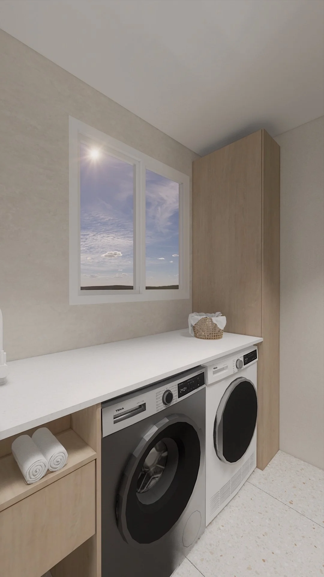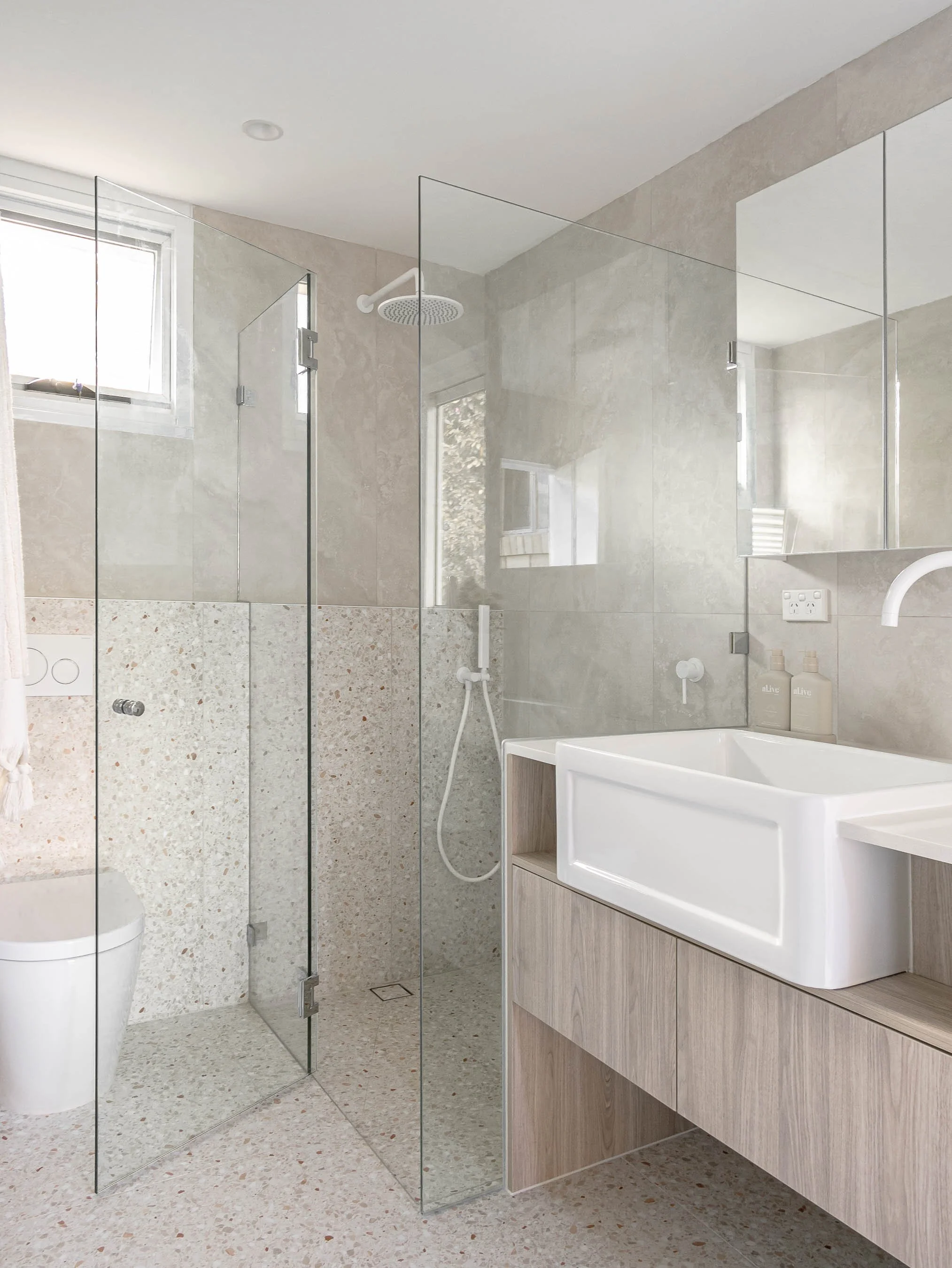 Neutral tones and stylish terrazzo flooring create a tranquil atmosphere, while custom cabinetry ensures every inch is optimised for storage, washer and dryer.